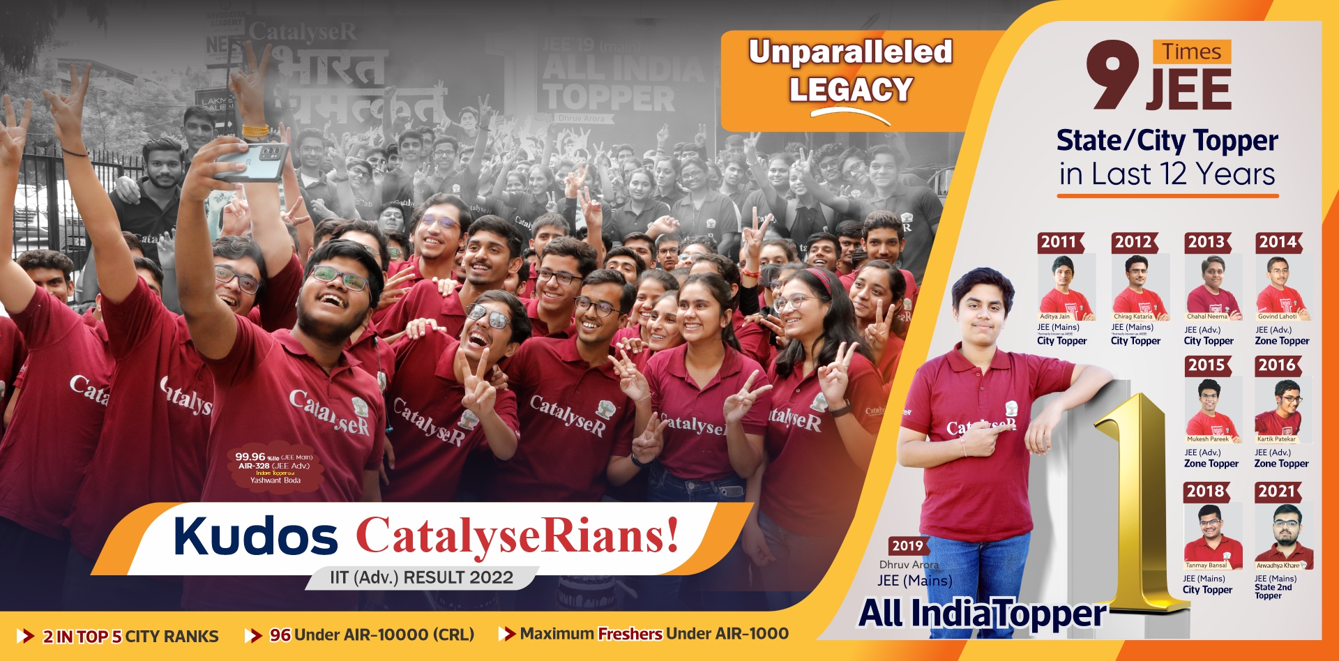 Providing excellent guidance and support to students, CatalyseR offers high selection rates for top IITs, many freshers under AIR-1000, and a 22% selection rate for JEE (Adv.). Faculty members have extensive experience, including alumni from MIT (Cambridge University), ensuring students receive excellent preparation. So what are you waiting for? Become a CatalyseRian and reach your full potential to ace the IIT JEE.